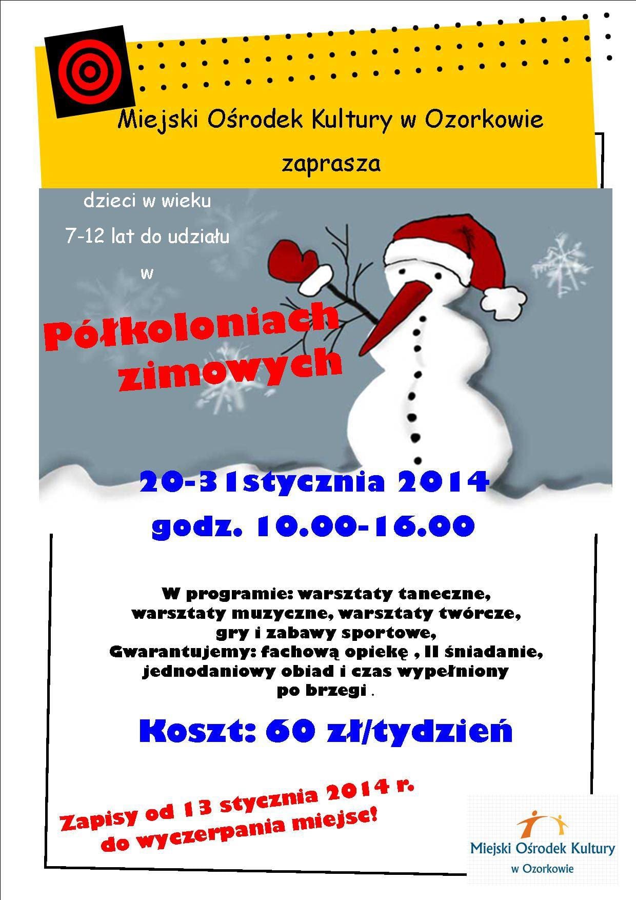 Miejski Ośrodek Kultury w Ozorkowie zaprasza dzieci w wieku 7-12 lat do udziału w półkoloniach zimowych, które odbęda się w dniach 20-31 stycznia 2014 r.