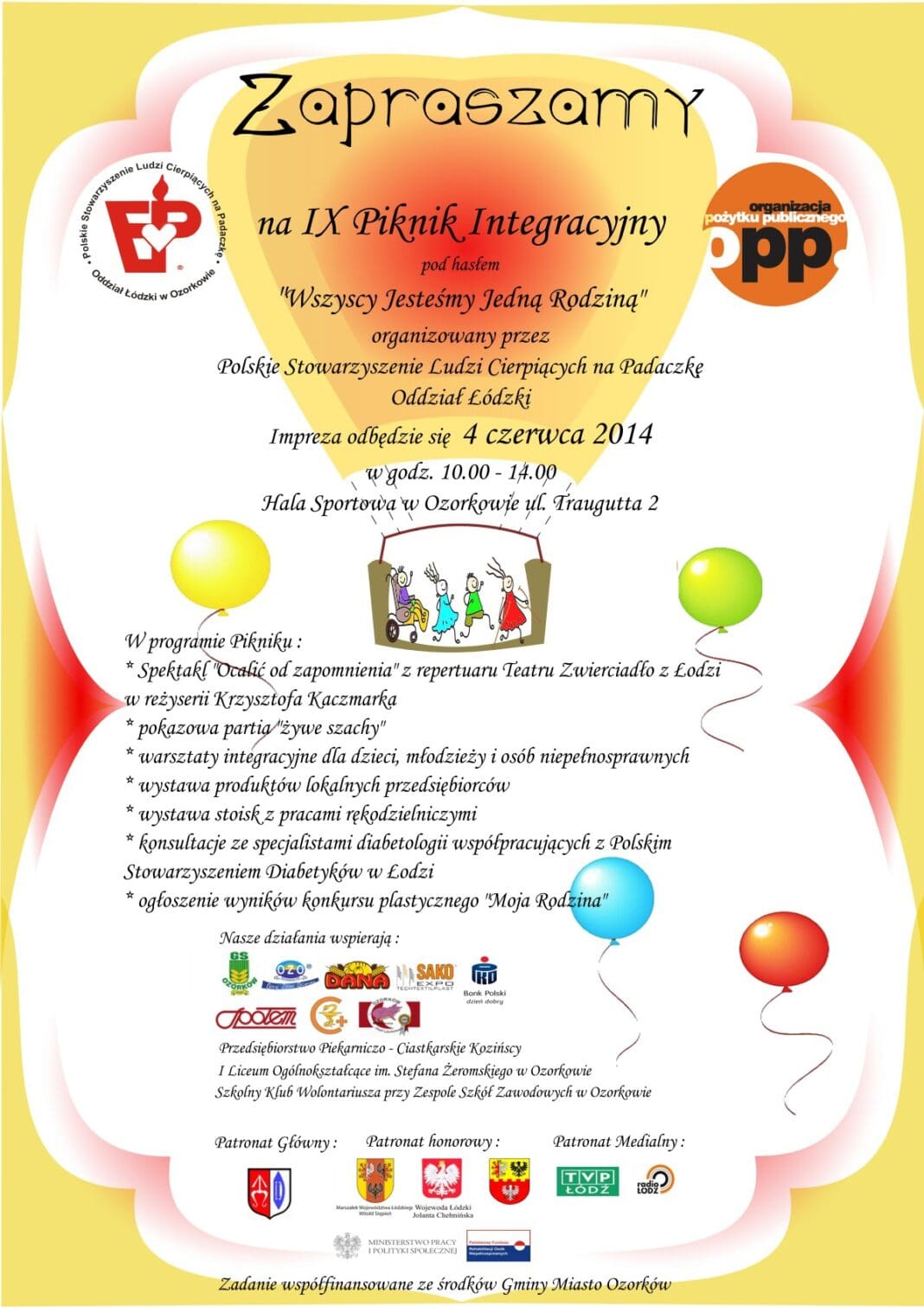 Polskie Stowarzyszenie Ludzi Cierpiących na Padaczkę ? Oddział Łódzki serdecznie zaprasza wszystkich zainteresowanych do udziału w IX Pikniku Integracyjnym pod hasłem ?Wszyscy jesteśmy jedną rodziną?, organizowanym w ramach projektu, m.in. pod patronatem Burmistrza Miasta Ozorkowa, który odbędzie się w dniu 4 czerwca 2014 r. od godz. 10.00 na terenie Hali Sportowej przy ul. Traugutta 2 w Ozorkowie.