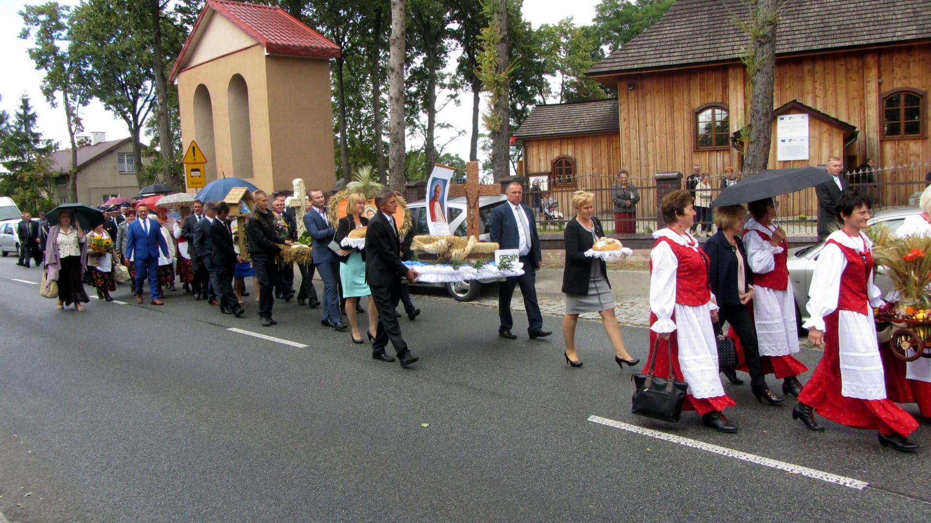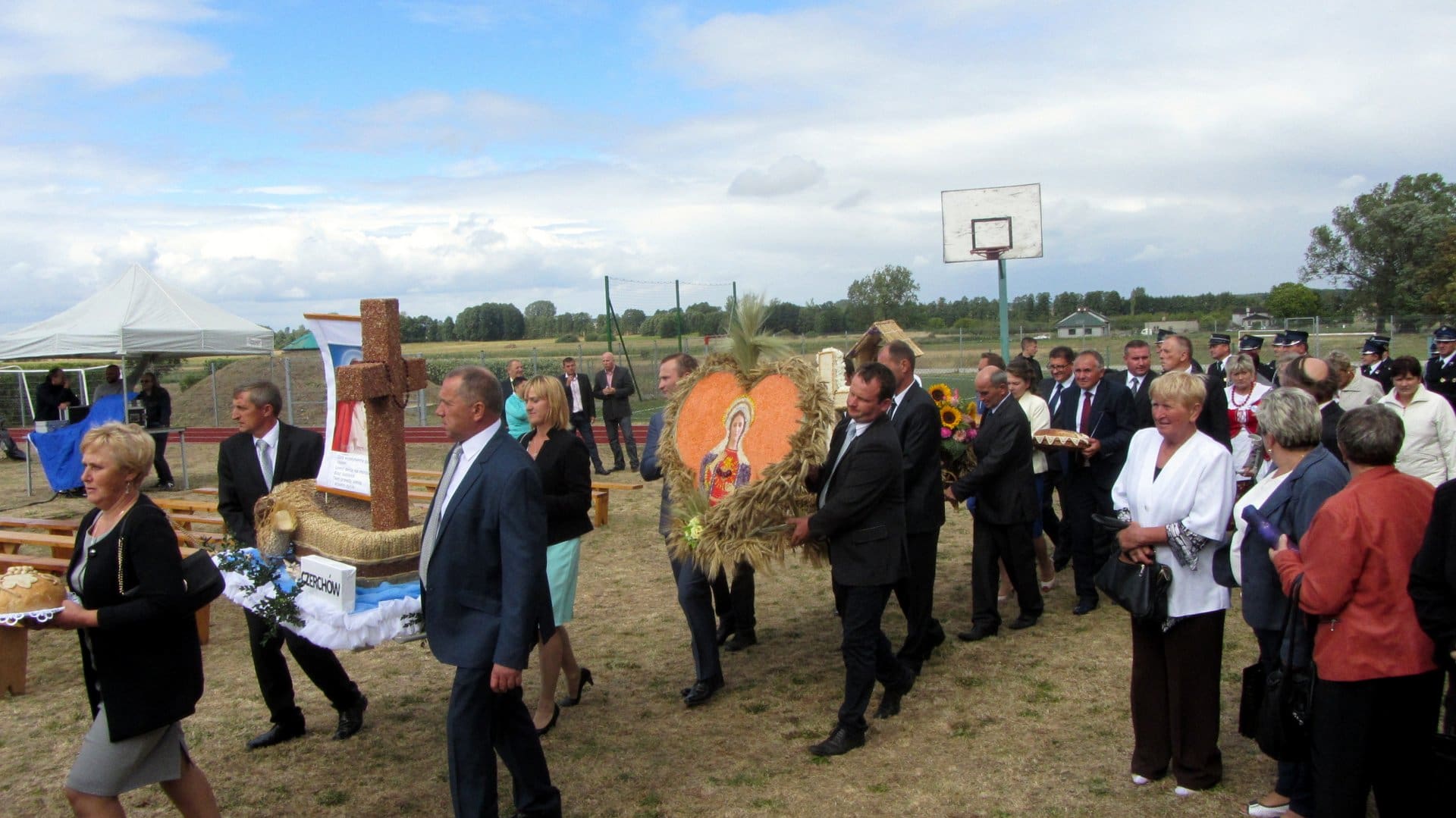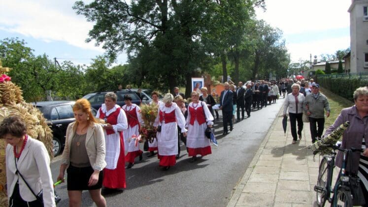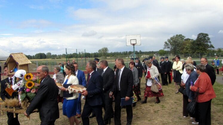 Po mszy św. Starościna Beata Szymczak i Starosta Marek Gawęda poprowadzili gości korowodem dożynkowym na boisko szkolne przy Zespole Szkół w Modlnej.