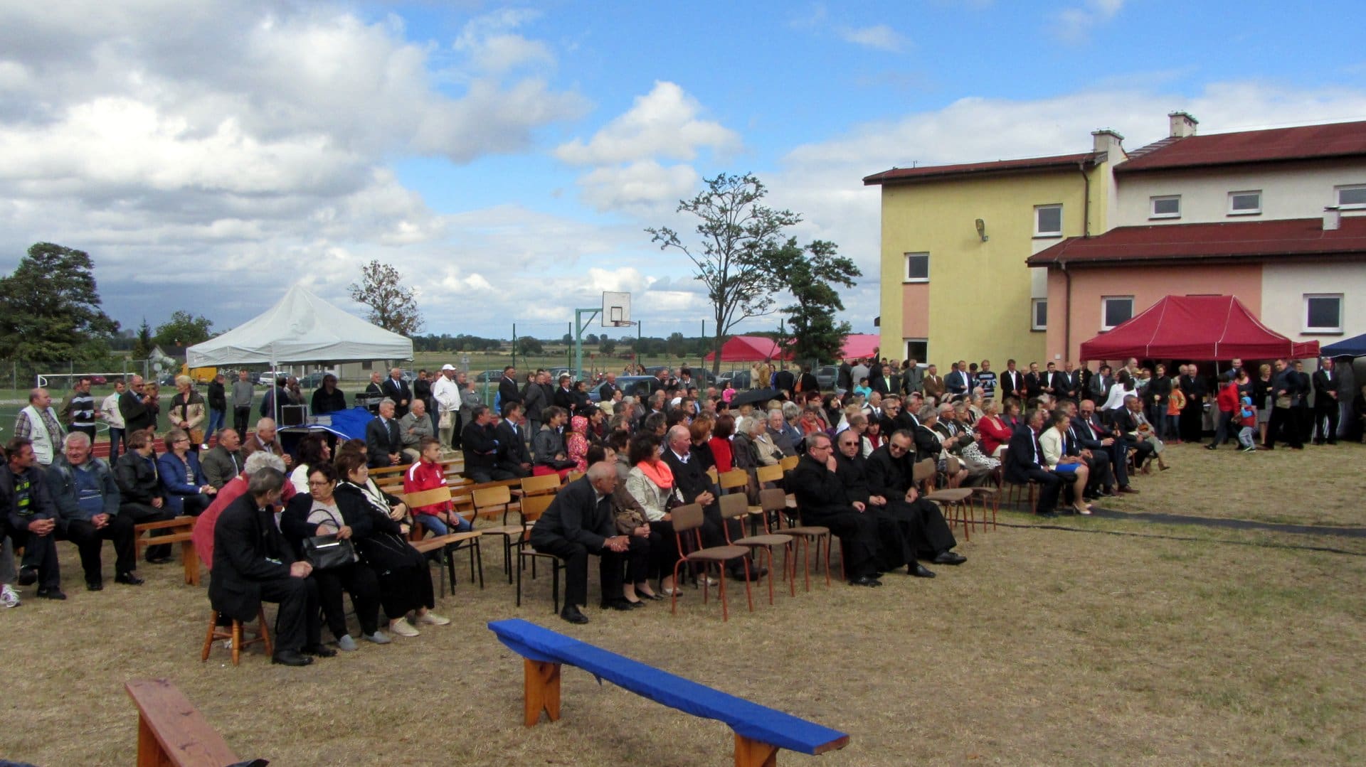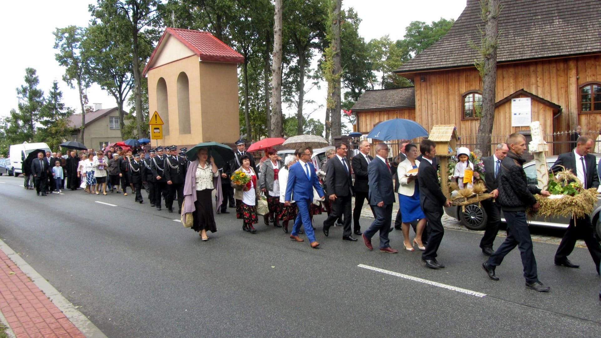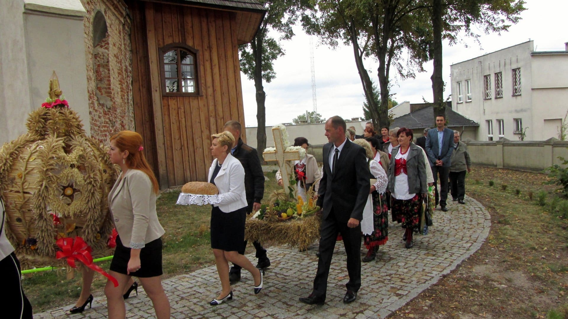 Po mszy św. Starościna Beata Szymczak i Starosta Marek Gawęda poprowadzili gości korowodem dożynkowym na boisko szkolne przy Zespole Szkół w Modlnej.