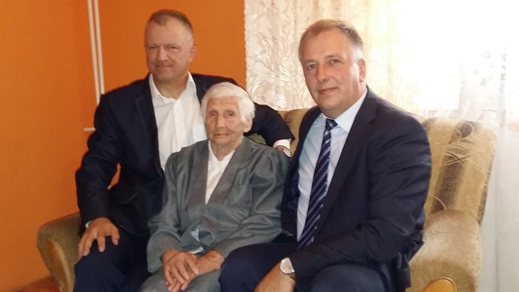 - Pani Janina z Tkaczewa skończyła 100 lat. PO prawej wójt gminy Ozorków Tomasz Komorowski, po lewej radny Krzysztof Grabarczyk. / fot. ug-ozorkow.pl
