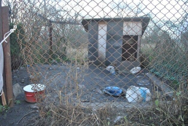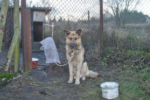Pies nie miał nawet szans swobodnie się położyć o schowaniu do budy nie było mowy. W pobliżu kilka zardzewiałych naczyń bez wody i pożywienia.