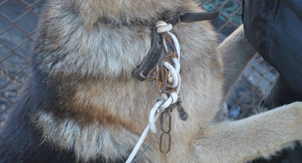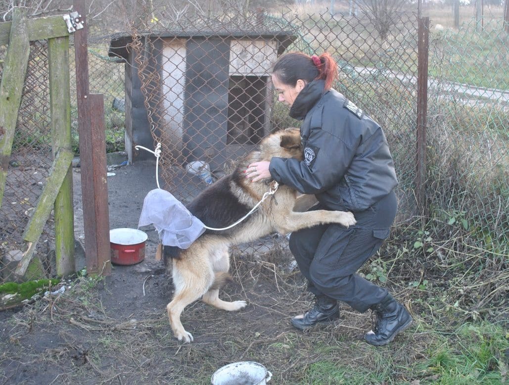 Kilku letni duży pies był przywiązany kablem elektrycznym wzmocnionym drutem do fragmentu ogrodzenia prowizorycznego kojca znajdującego się na terenie posesji. Długość kabla wiodący od obroży psa, silnie zaciśniętej i zaplątanej w łańcuchy i druty do ogrodzenia wynosiła 70 cm!