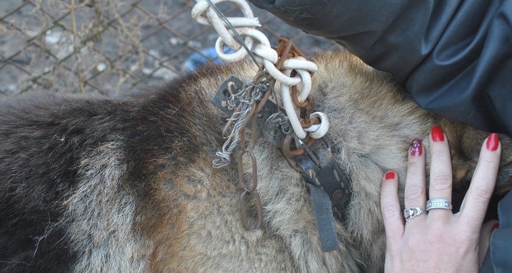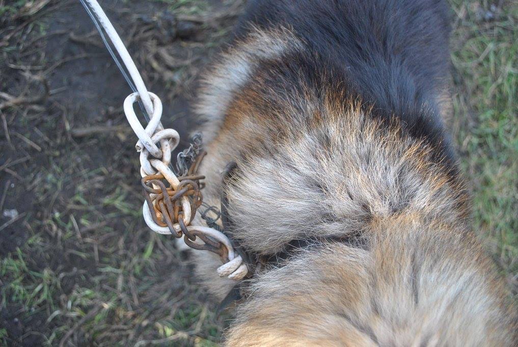 Kilku letni duży pies był przywiązany kablem elektrycznym wzmocnionym drutem do fragmentu ogrodzenia prowizorycznego kojca znajdującego się na terenie posesji. Długość kabla wiodący od obroży psa, silnie zaciśniętej i zaplątanej w łańcuchy i druty do ogrodzenia wynosiła 70 cm!