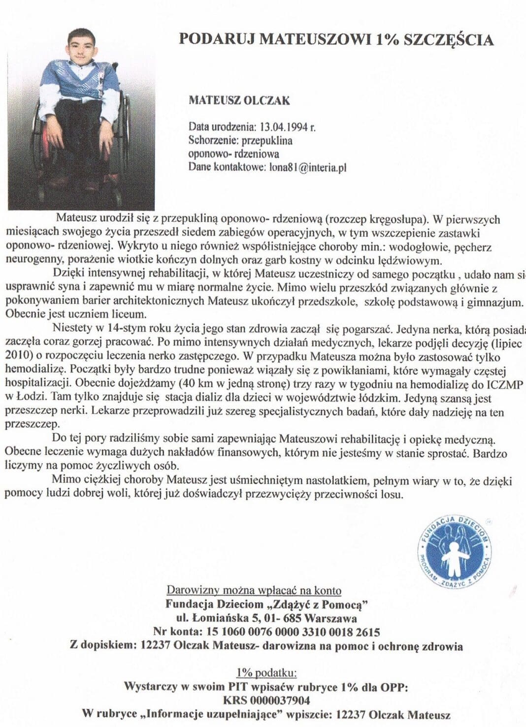 Mateusz urodził się z przepukliną oponowo-rdzeniową (rozczep kręgosłupa). W pierwszych miesiącach swojego życia przeszedł siedem zabiegów operacyjnych, w tym wszczepienie zastawki oponowo-rdzeniowej. Wykryto u niego również współistniejące choroby min.: wodogłowie, pęcherz neurogenny, porażenie wiotkie kończyn dolnych oraz garb kostny w odcinku lędźwiowym.