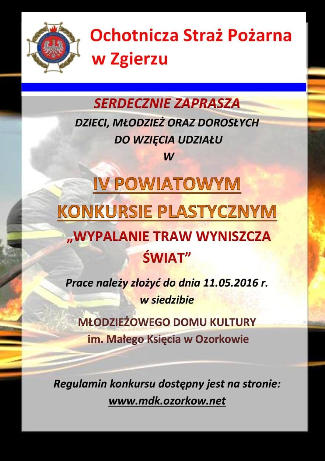 Ochotnicza Straż Pożarna w Zgierzu wraz z Młodzieżowym Domem Kultury im. Małego Księcia w Ozorkowie po raz 4 organizują konkurs, który ma celu rozwijanie wyobraźni, pomysłowości i twórczej aktywności dzieci i młodzieży poprzez plastyczne przedstawienie zagrożeń jakie niesie za sobą wypalanie traw. Zabawa jest najlepszym sposobem na kształtowanie właściwych zachowań i uczenie młodych pokoleń postawy wobec środowiska naturalnego.