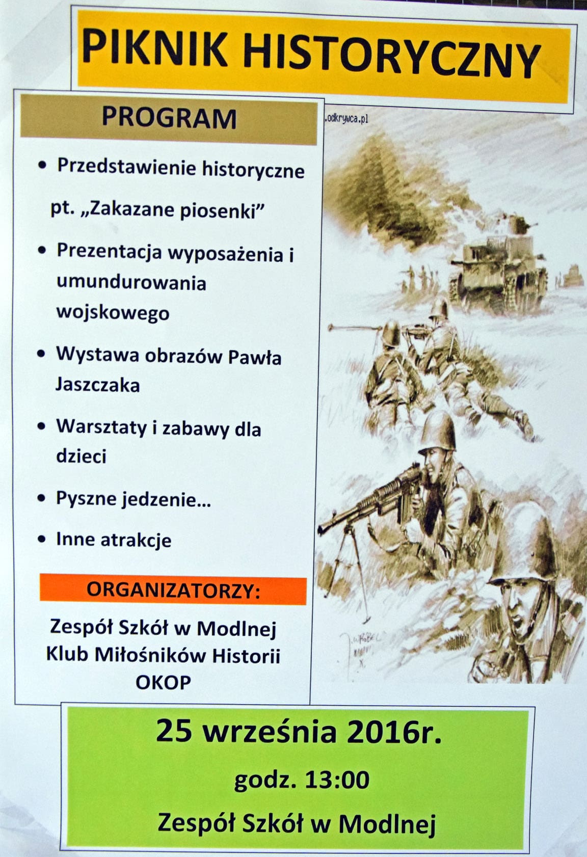 W niedzielę, 25 września 2016 r., w Zespole Szkół w Modlnej odbył się Piknik historyczny. Rozpoczął się przedstawieniem historycznym uczniów pt. „Zakazane piosenki”, podczas którego publiczność wraz z aktorami śpiewała pieśni patriotyczne.