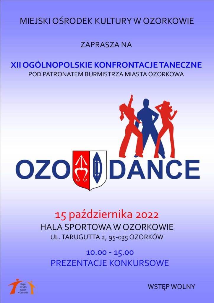 Po pandemicznej przerwie zapraszamy do udziału w XII Ogólnopolskich Konfrontacjach Tanecznych – OZODANCE 2022, które odbędą się 15 października br. Zachęcamy do zapoznania się z Regulaminem Konkursu: