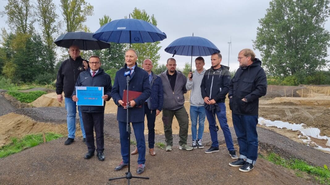 Nad parzęczewskim zalewem powstaje największy pumptrack na świecie. Dziś odbyła się konferencja prasowa z udziałem Posła na Sejm Marka Matuszewskiego – jednocześnie wiceprzewodniczącego Sejmowej Komisji Sportu, który przekazał informację o dodatkowym wsparciu tej inwestycji kwotą 747 400,00 zł pochodzącą z Rządowego Programu Sportowa Polska przyznaną przez Ministerstwo Sportu i Turystyki.