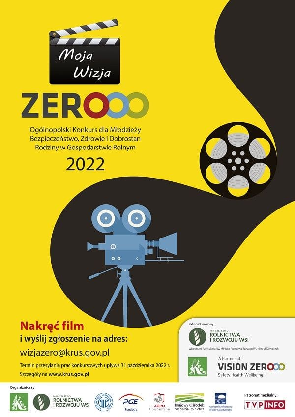 Pamiętajcie – wystarczy mieć oryginalny pomysł, nakręcić krótki (do 2 minut) film i wysłać do Centrali KRUS. Czekają bardzo atrakcyjne nagrody, a o szczegółach przeczytacie na stronie internetowej www.krus.gov.pl, w zakładce Moja Wizja Zero.