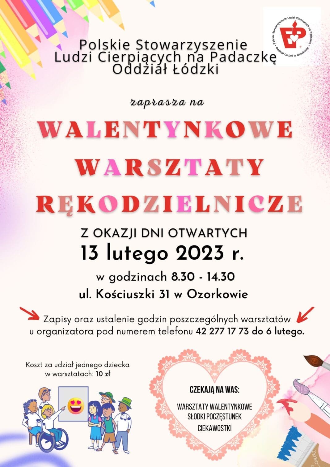 Polskie Stowarzyszenie Ludzi Cierpiących na Padaczkę Oddział Łódzki zaprasza na walentynkowe warsztaty rękodzielnicze, które odbędą się 13 lutego przy ul. Kościuszki 31 w Ozorkowie. Na dzieci, oprócz manualnych zajęć czekać będzie wiele dodatkowych atrakcji. Organizator zaprasza do zapisów do 6 lutego.