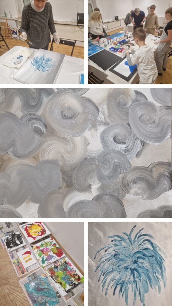 Przed trzy dni pracowali uczestnicy warsztatów malarskich, aby zgłębić tajniki tworzenia obrazów abstrakcyjnych. Pierwsze zajęcia dla każdej z grup wiekowych miały charakter teoretyczne, a dwa kolejne spotkania poświęcone były już pracy z materiałami plastycznymi. Zatem pędzle, blejtramy, farby, sztalugi, palety, wałki… i wiele innych użytecznych narzędzi poszło w ruch. Jedynym ograniczeniem była własna wyobraźnia.