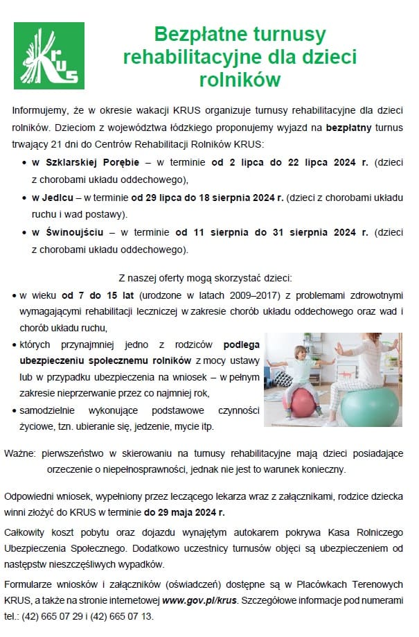 Zapraszamy do zapoznania się z informacją KRUS na temat bezpłatnych turnusów rehabilitacyjnych dla dzieci rolników