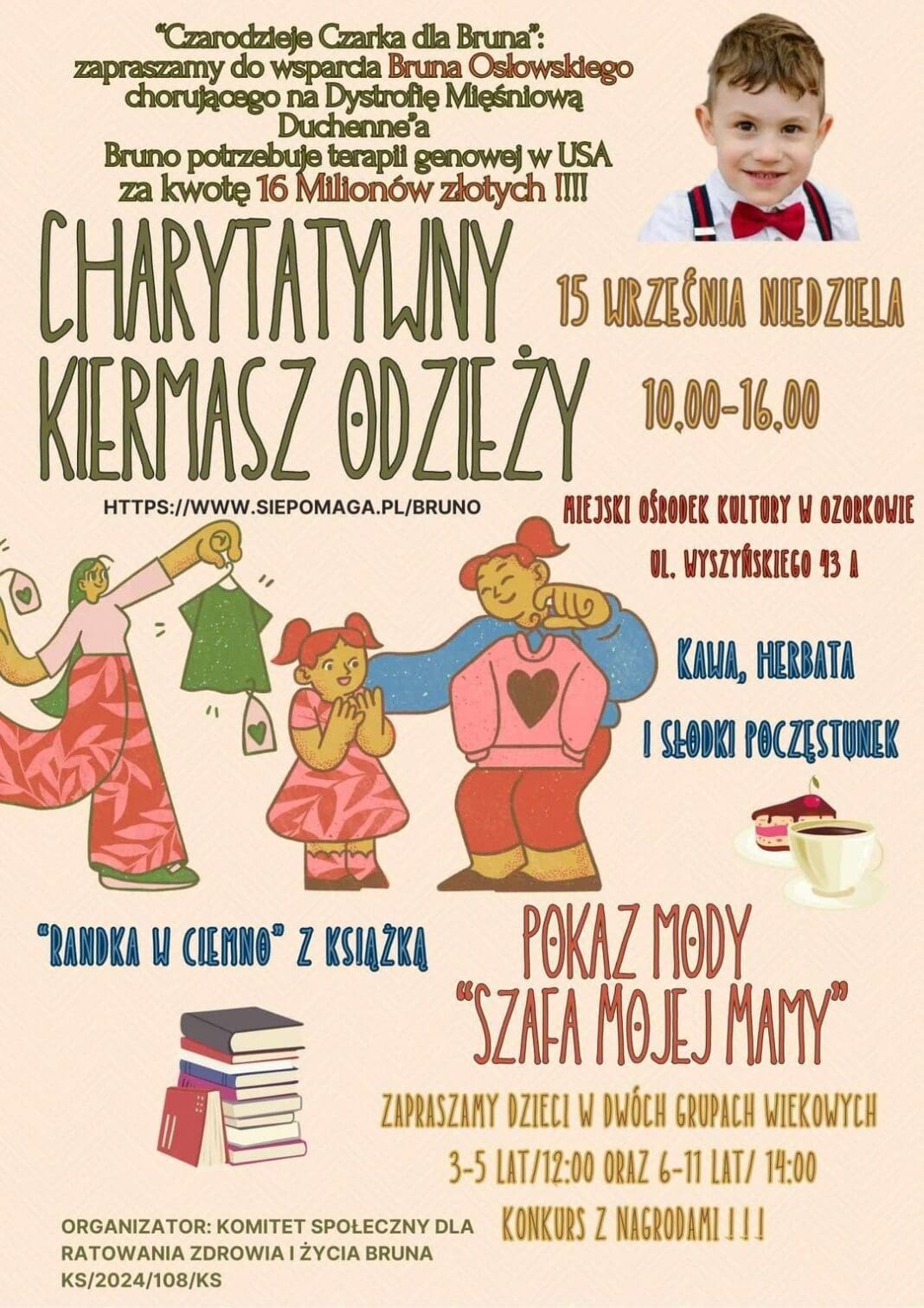 Przypominamy; 15 września, w niedzielę, w Miejskim Ośrodku Kultury w Ozorkowie CzarodziejeCzarka dla BRUNA. Licytacje dla Bruna Osłowskiego organizują akcję charytatywną dla Bruna chorującego na dystrofię mięśniową Duchenna’a. Bruno potrzebuje terapii genowej w USA za kwotę 16 milionów złotych.
