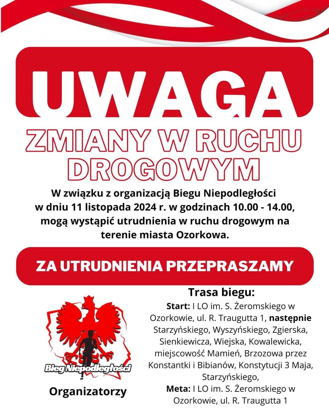 Uwaga kierowcy11 listopada w godz. 10.00 – 14.00 w związku z Biegiem Niepodległości wystąpią utrudnienia w ruchu na terenie Ozorkowa.