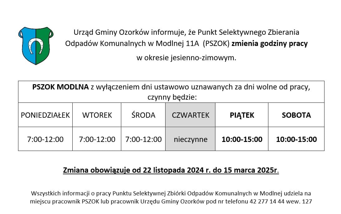 W okresie zimowym nastąpi zmiana godzin funkcjonowania Punktu Selektywnego Zbierania Odpadów Komunalnych w Modlnej. Zmiana obowiązywać będzie od 22 listopada 2024 r. do 15 marca 2025 r. Prosimy o zapoznanie się z treścią załączonej poniżej tabeli.
