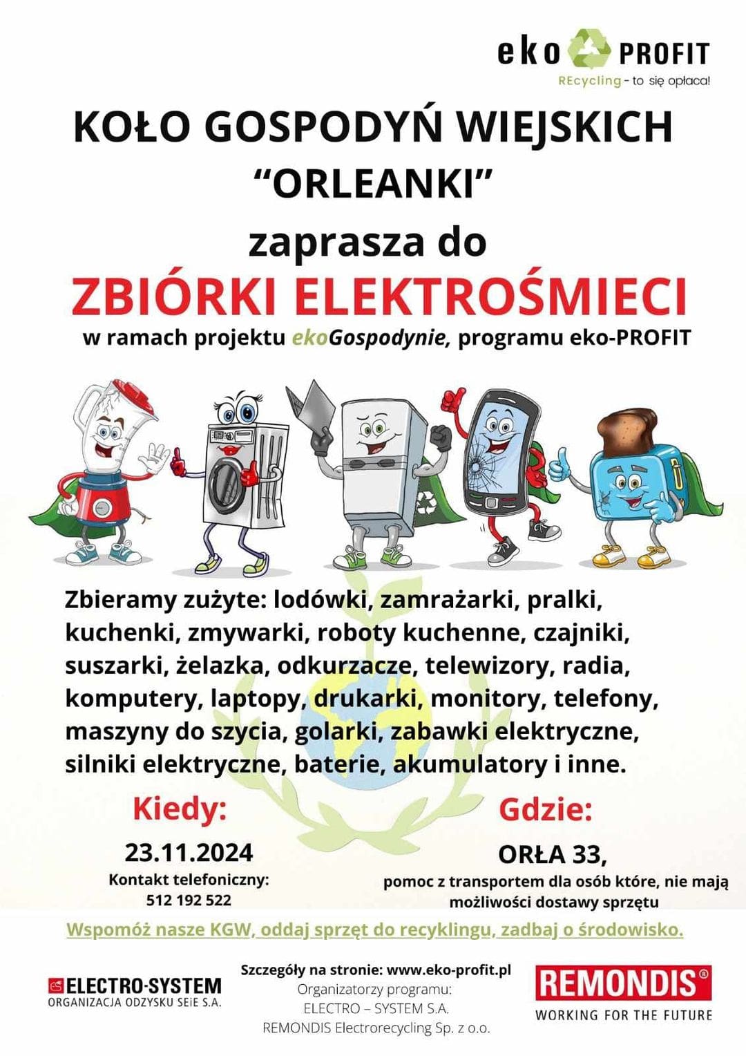 Zbiórka elektrośmieci z KGW Orleanki! Masz stare, niedziałające sprzęty jak telewizory, lodówki czy żelazka? Przywieź je 23 listopada (sobota) na plac przy Remizie Strażackiej w Orłej! Zachęcamy do udziału