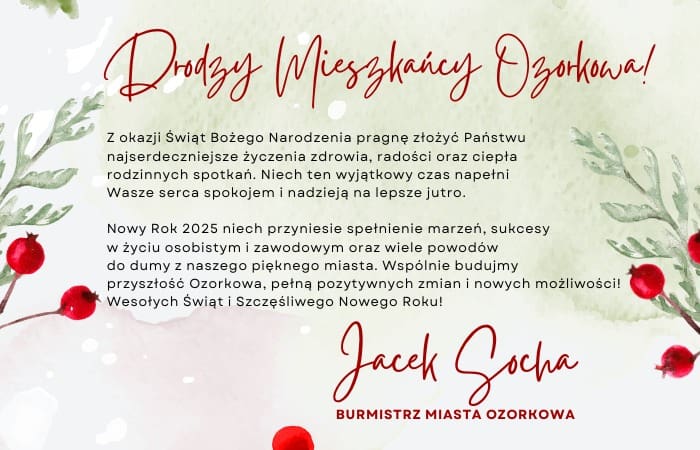 Strona głównaAktualnościMiasto OzorkówNajlepsze życzenia z okazji Świąt Bożego Narodzenia składa Burmistrz Jacek Socha