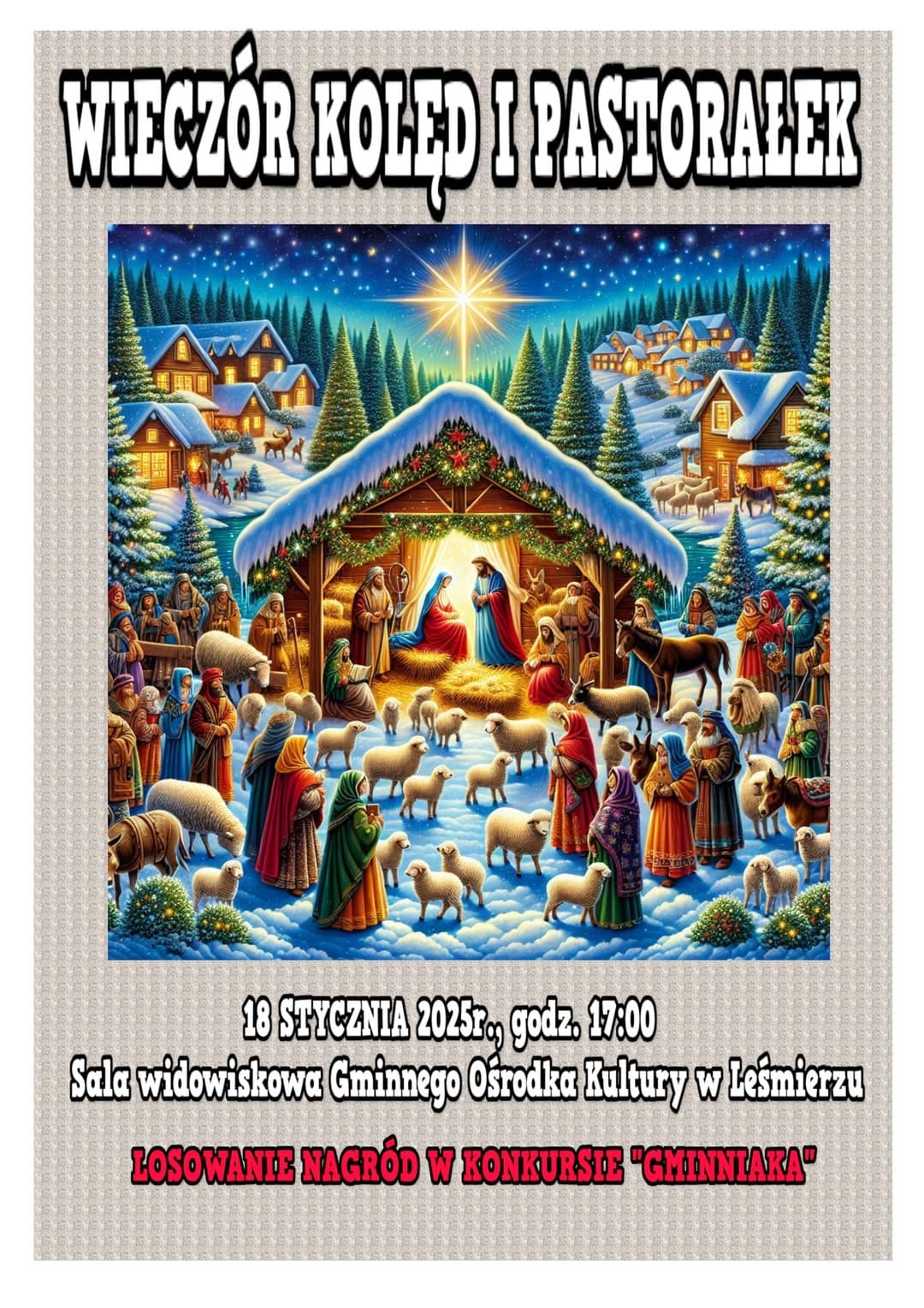 Zapraszamy na wyjątkowy Wieczór Kolęd i Pastorałek, który odbędzie się w nadchodzącą sobotę, 18 stycznia, w sali widowiskowej Gminnego Ośrodka Kultury w Leśmierzu. Zaczynamy o godzinie 17.00. W programie przewidziano losowanie nagród w popularnym konkursie "Gminniaka".