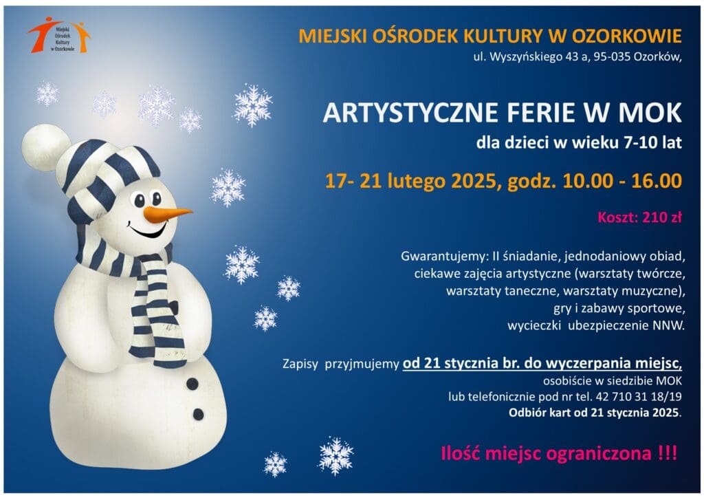 Strona głównaMiasto OzorkówMiejski Ośrodek KulturyRozpoczęcie zapisów na półkolonie: Zgłoszenia już od 21 stycznia 2025 roku