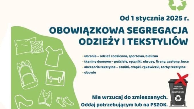 1 stycznia 2025 roku wchodzi w życie ustawowy obowiązek segregacji odpadów tekstylnych oraz odzieży w każdej gminie. Zmiany te wynikają z art. 14 ustawy z dnia 19 lipca 2019 roku, która nowelizuje przepisy dotyczące utrzymania czystości i porządku w gminach (Dz.U. z 2019 roku, poz. 1579). Od nowego roku gminy będą zobligowane do przyjmowania odpadów tekstylnych i odzieżowych w tzw. punktach selektywnego zbierania odpadów komunalnych.