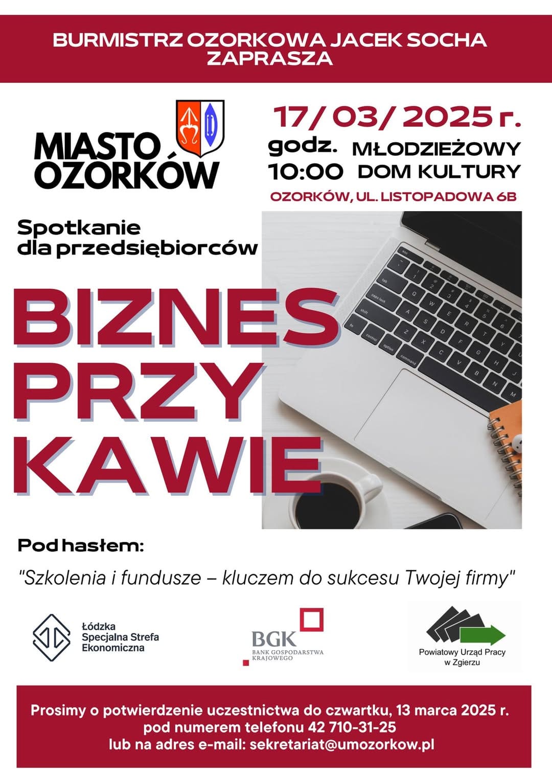 Burmistrz Jacek Socha serdecznie zaprasza przedsiębiorców do udziału w najbliższym spotkaniu z cyklu „Biznes przy kawie”, które odbędzie się 17 marca o godzinie 10:00 w Młodzieżowym Domu Kultury przy ulicy Listopadowej 6b. W trakcie wydarzenia głównym tematem dyskusji będą szkolenia oraz dostępne fundusze, które mogą być wsparciem dla lokalnych firm. Udział w spotkaniu prosimy potwierdzić do 13 marca, dzwoniąc pod numer telefonu 42 710 31 25 lub wysyłając e-mail na adres sekretariat@umozorkow.pl.
