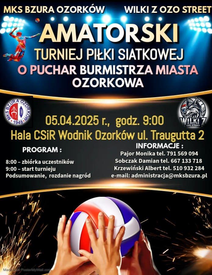 W Ozorkowie szykuje się sportowe wydarzenie, które z pewnością zainteresuje miłośników siatkówki. Już 5 kwietnia odbędzie się I Amatorski Turniej Piłki Siatkowej o prestiżowy Puchar Burmistrza Miasta Ozorkowa. Na to wyjątkowe święto sportu zapraszają współorganizatorzy: MKS Bzura Ozorków oraz Wilki z Ozo street. Celem turnieju jest integracja amatorskich drużyn z Ozorkowa, gminy Ozorków oraz pobliskich miejscowości. Zaproszenie jest otwarte dla różnych grup: od przedstawicieli firm, służb mundurowych, po zespoły składające się z grup znajomych.