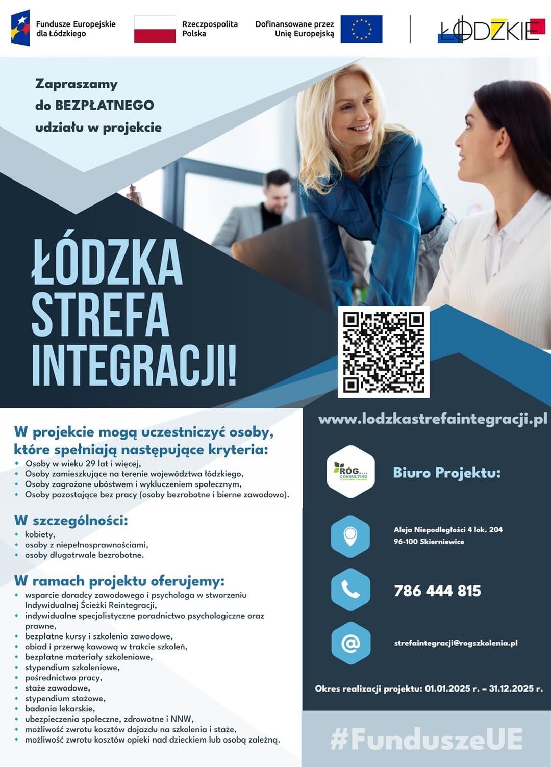 Województwo łódzkie oferuje możliwość bezpłatnego uczestnictwa w projekcie „Łódzka Strefa Integracji!”, skierowanym do osób powyżej 29. roku życia. Program koncentruje się na wsparciu osób narażonych na ubóstwo oraz wykluczenie społeczne, a także na promowaniu równości szans i aktywnego uczestnictwa w życiu społecznym.