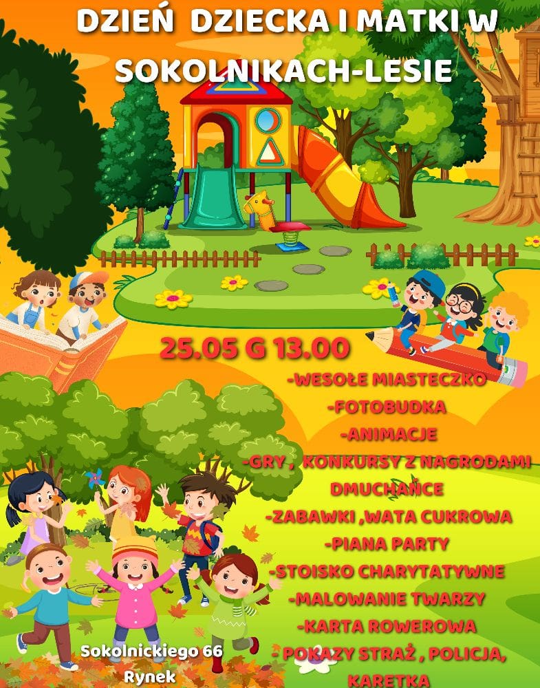 Plac Targowy w Sokolnikach Lesie ul. Sokolnickiego 66, Sokolniki-LasSerdecznie zapraszamy wszystkich Mieszkańców Sokolnik Lasu i okolic na kolejną edycję Dnia Dziecka w Sokolnikach-Lesie w tym roku połączymy to radosne święto z Dniem Matki. Cały dzień świetnej rodzinnej zabawy. Szykujemy wspaniałe DARMOWE atrakcje.